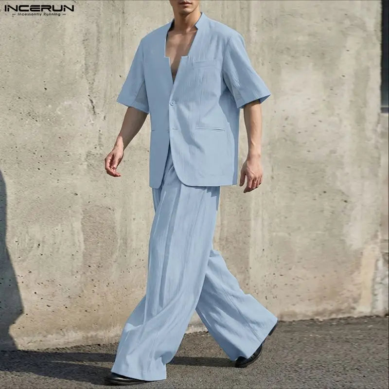 Incerun Men's Two-Piece Oversized Set: Lapel 3/4 Sleeve Shirt and Wide-Leg Pants