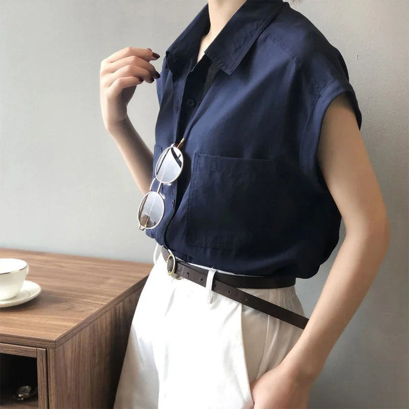 Women's Loose-Fitting Short Sleeve Shirt Blouse with Thin Style Lapel and Pocket