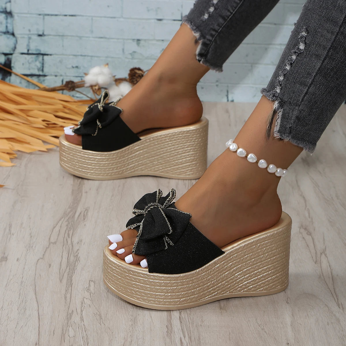 Women's Heeled Slides - Wedge Platform Slippers With Butterfly Knot Decoration