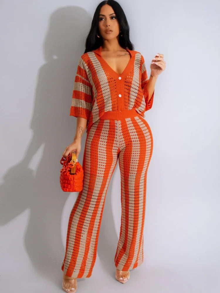 Luxurious Women's Knitted 2-Piece Set | Elegant Short Sleeve Button Top & Flowing Crocheted Pants