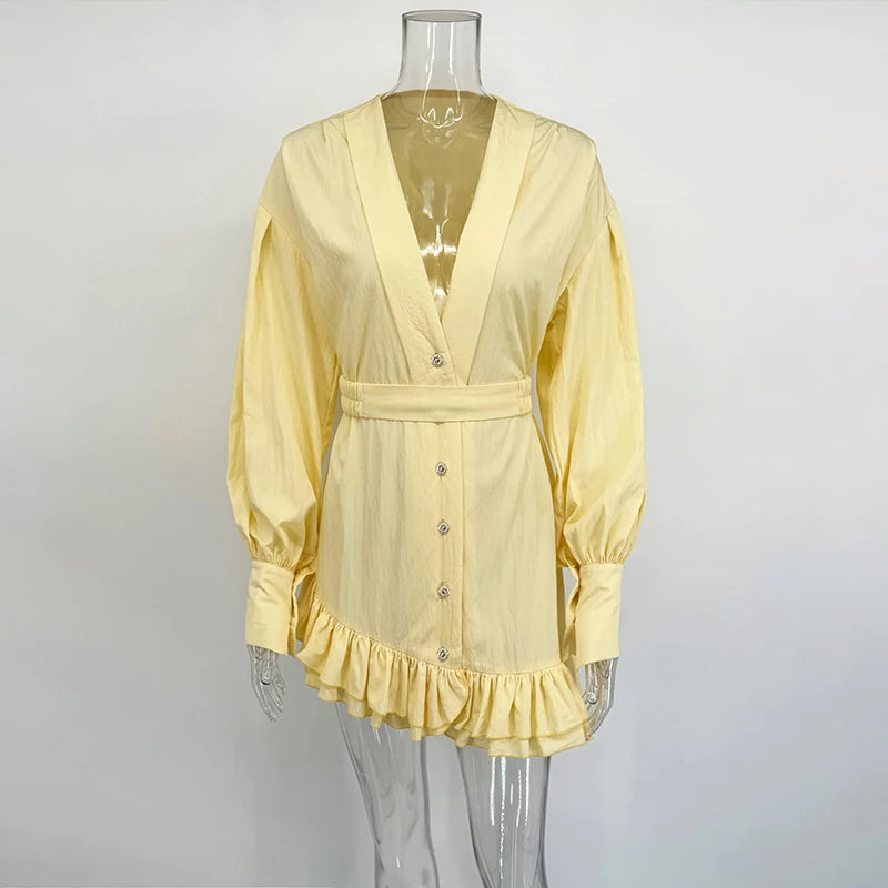 Luxurious Women's Ruffled Shirt Dress with Deep V-Neck & Elegant Lantern Sleeves
