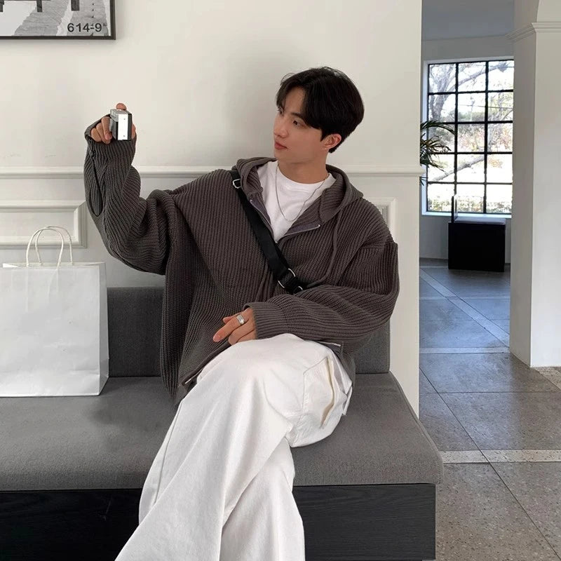 Men's Zip-Up Hooded Cardigan Sweater – Drop Shoulder Knitwear Jacket for Men