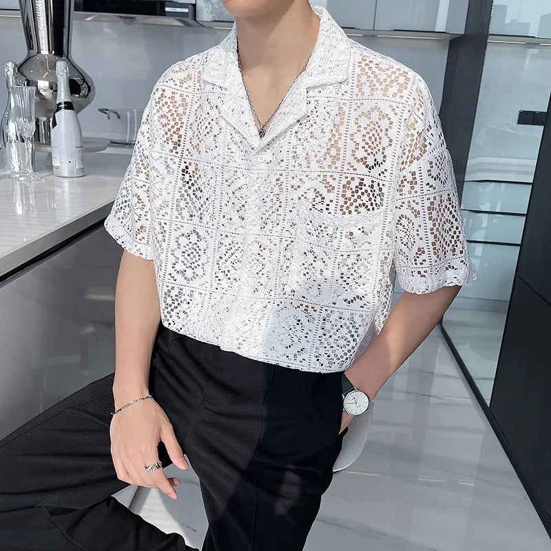 Elevate Your Style with the Lavish Retro Breathable Hollow Lace Collar Shirt for Men